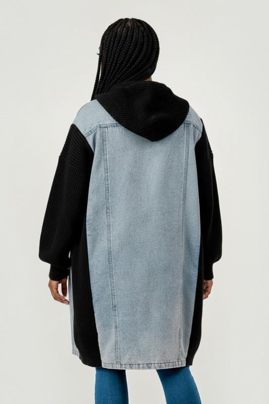 DENIM AND KNIT COLOR BLOCK LONG JACKET.