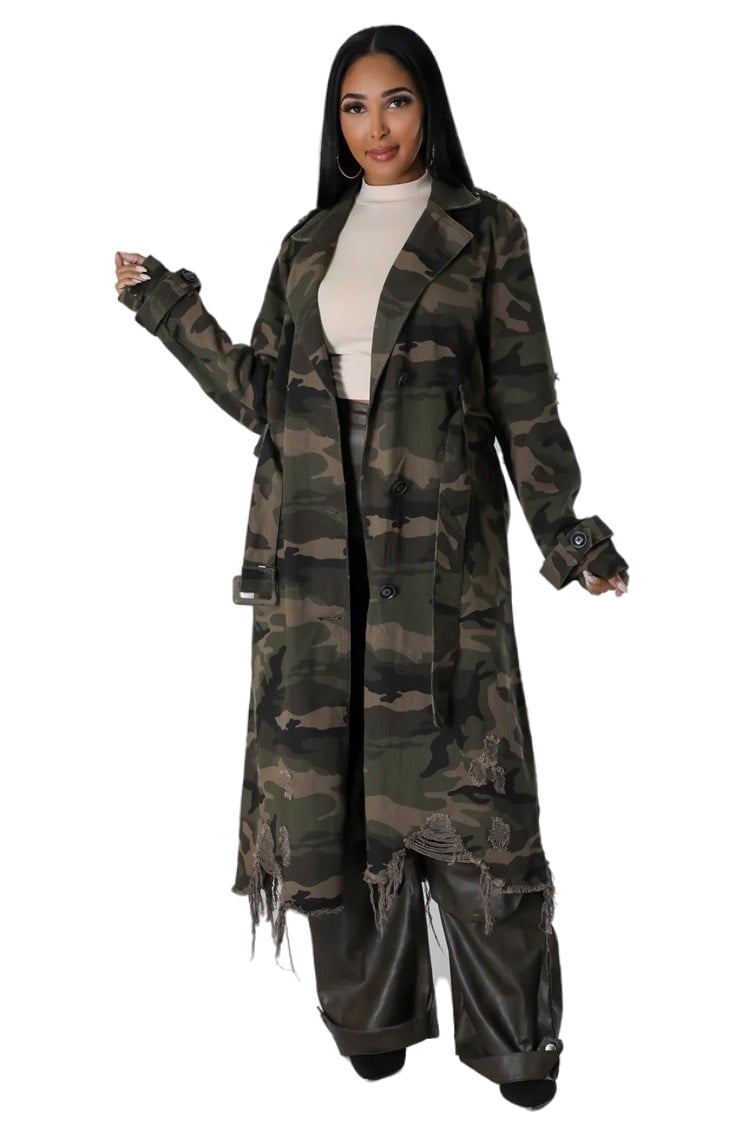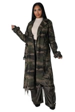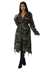 Camouflage design, front button, long sleeves, Point collar, Side pockets, Self-tie belt, trench coat